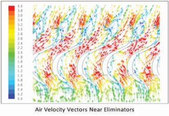 The air with the remaining drift droplets undergo another direction change and encounter the surface of the adjacent blade. The system continues to work on the principle of inertial separation. At the exit of the drift eliminator, the air undergoes a third direction change while the water droplets encounter a second notch, which entraps a majority of the drift droplets and brings them back into the system. Some other commercial crift eliminators have a rather large bulb at the exit of the drift eliminator, where most of the drift elimination is performed. These eliminators are not designed to optimize the use of the entire drift eliminator depth and the large bulb introduces a rather large static pressure in the cooling tower.